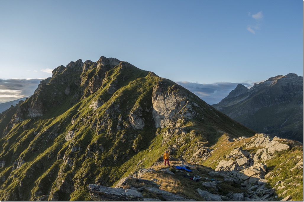 Once we reached the pass we started to look for a place for the night. There were several options available. We decided to start going up the ridge a bit until there was the first flat section which would give us some head start for tomorrow morning. Looking back on the ridge you can see the hut further down.