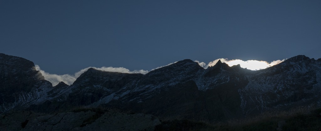 In the back the sun is slowly moving towards the ridge, fighting with some clouds.