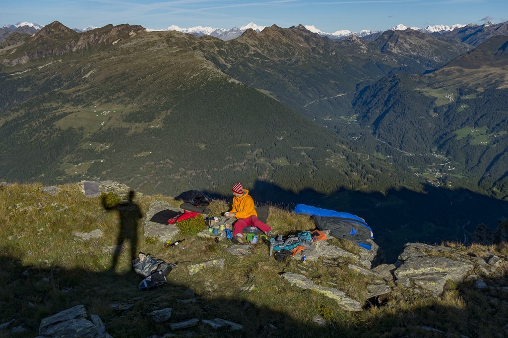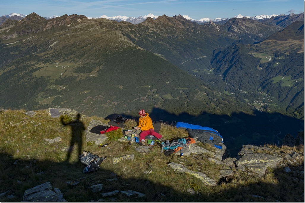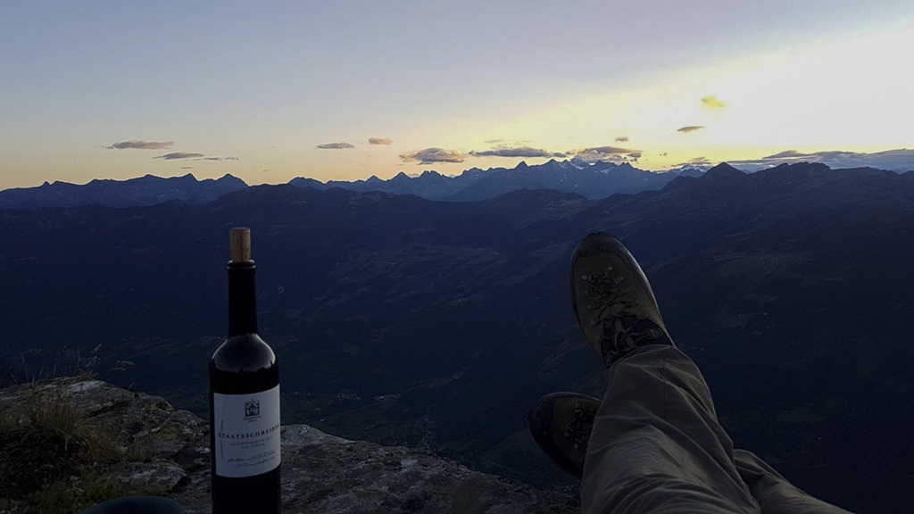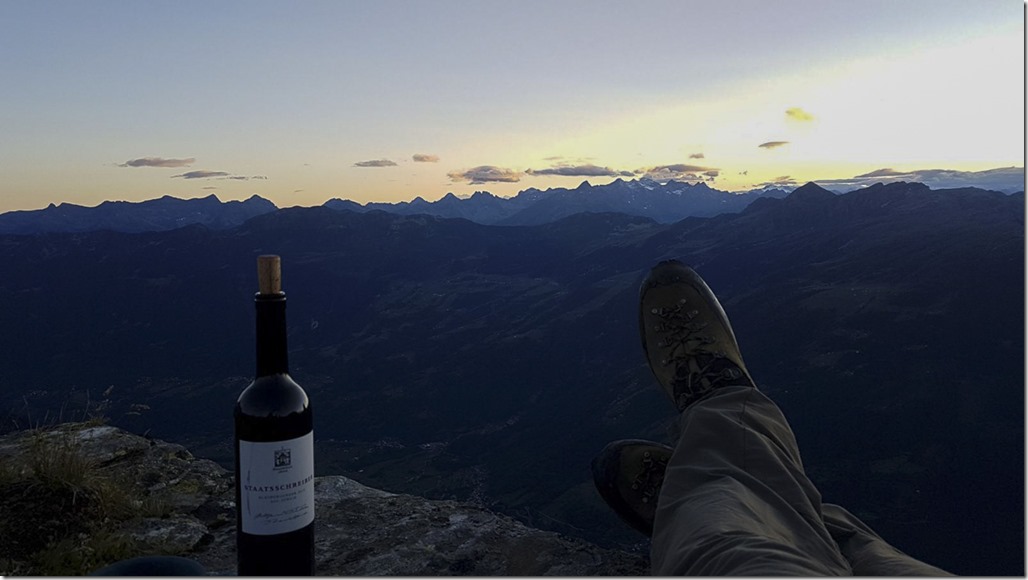 Eventually we found a very nice location with a great panorama for the night. The wind was a bit of a problem as it was blowing alongside the ridge but as long as the sun was up it was still warm and when the sun would go down the wind would probably just go away. So we started the preparations for the night which usually means open the bottle of wine and enjoy the view and eventually do some cooking.