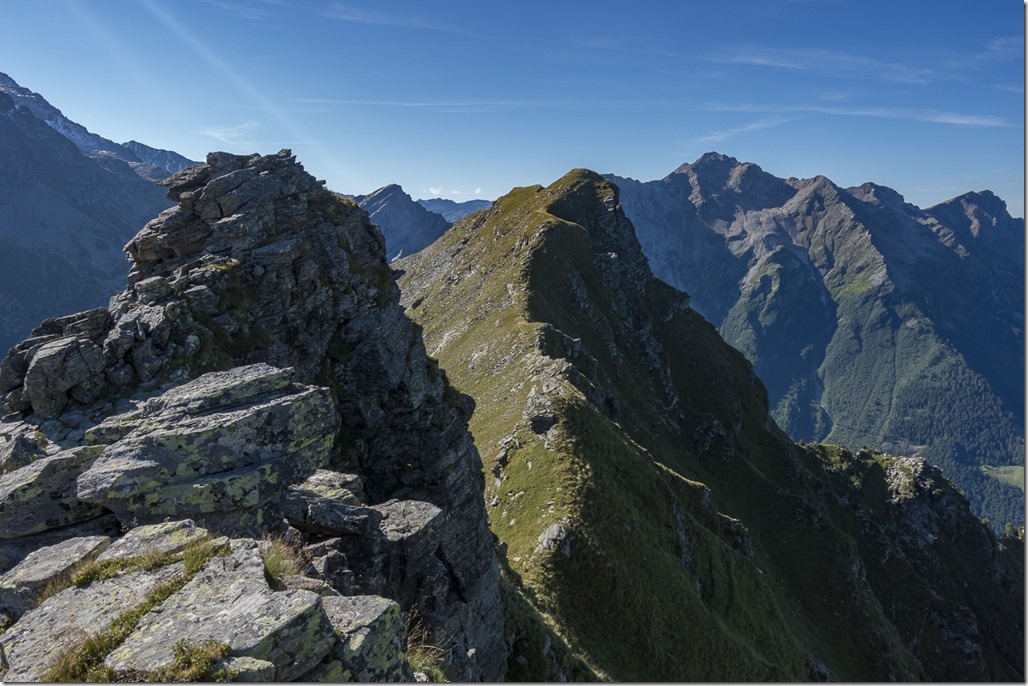 After having crossed the last high peak on the ridge we started to slowly get down. And we started our discussions about which pizza we should order after the hike. But the ridge had one last surprise for us. If I would have to rate any difficult section of the hike than it was actually the section which was still ahead of us. It wasn’t difficult as there were again fixed ropes installed. But the fact that it was steep on both sides and the trail was getting narrower and narrower was just a different experience. So we stopped our pizza talk in order to concentrate. Of course once we were through this section we resumed the discussion about the menu and extended it to drinks and other options.