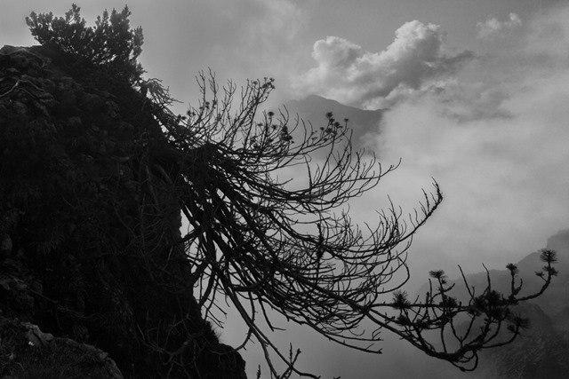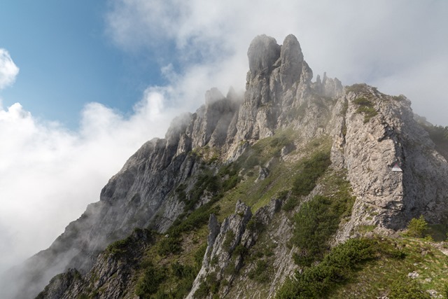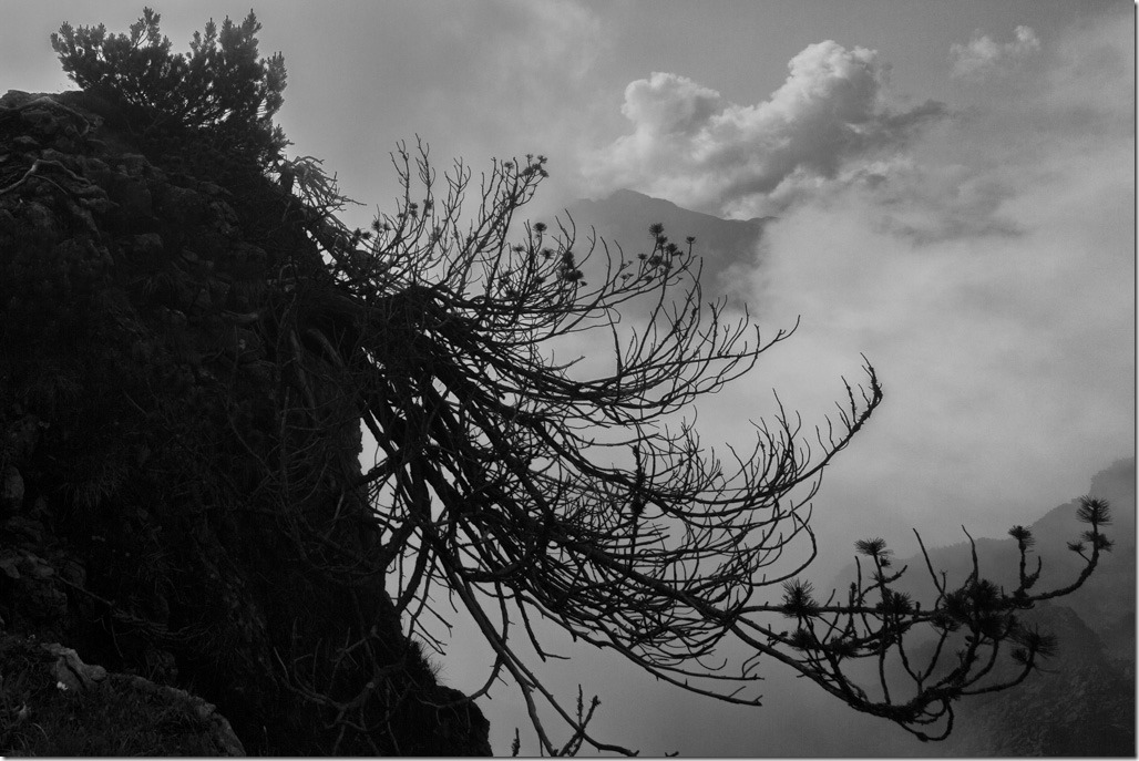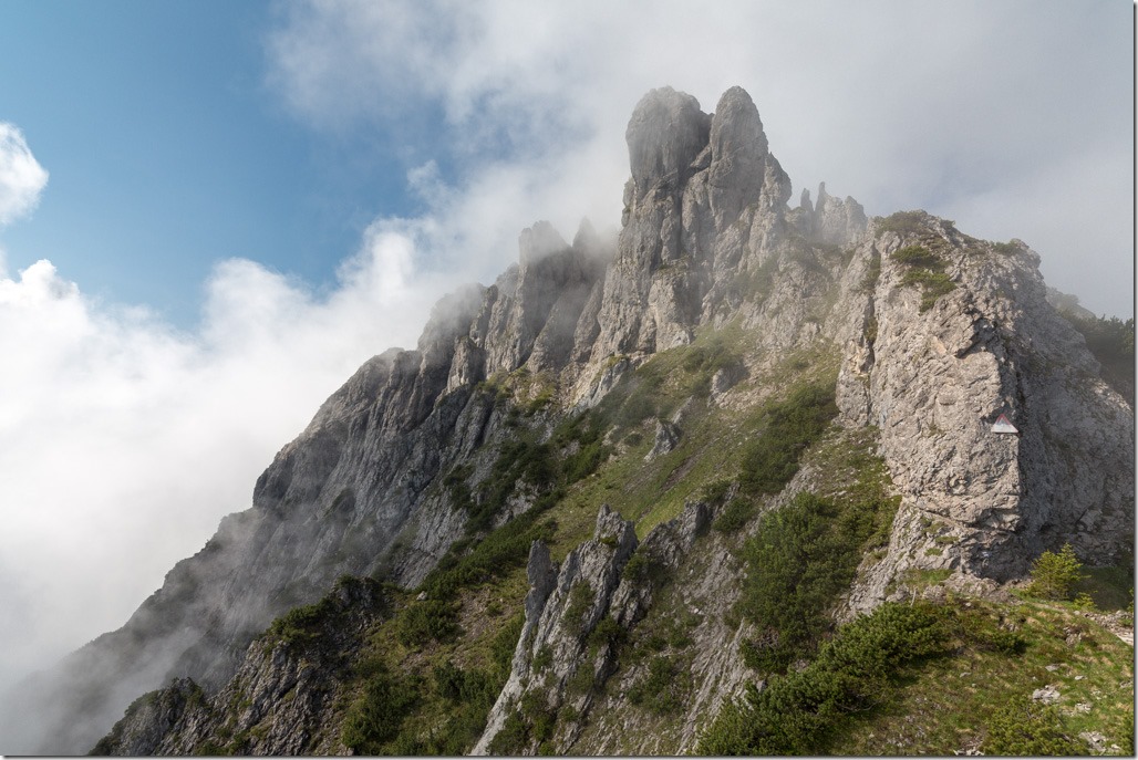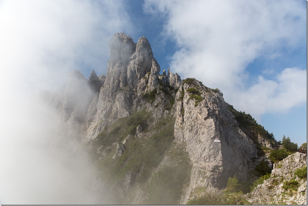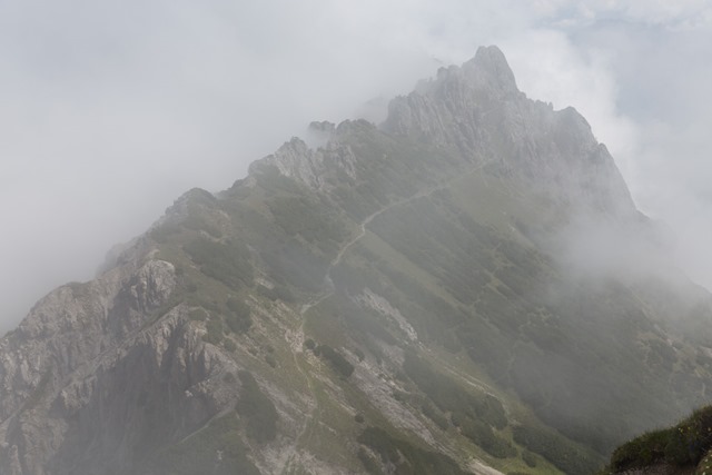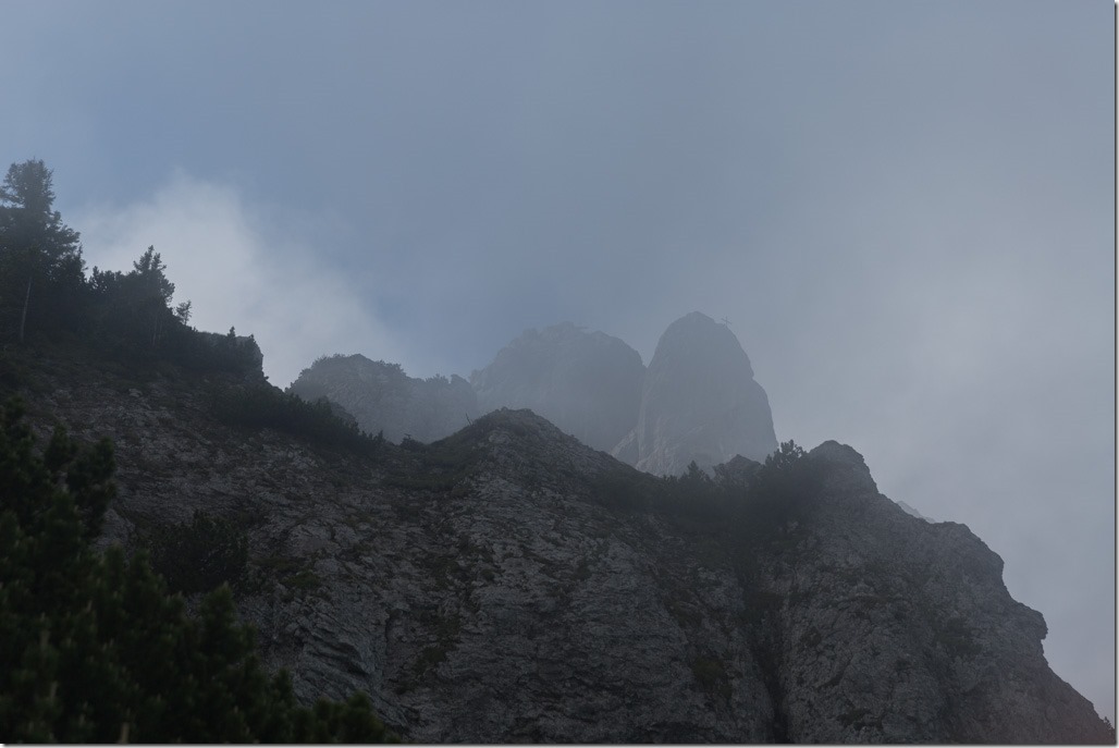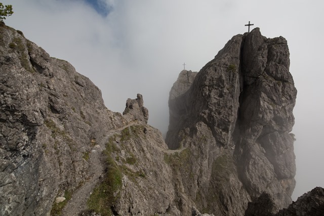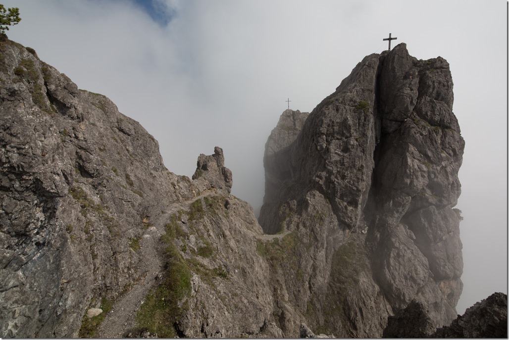 Immer näher kommen sie, und immer steiler wird es. Man beachte das Gipfelkreuz im Nebel das wir noch aus anderen Perspektiven sehen werden.