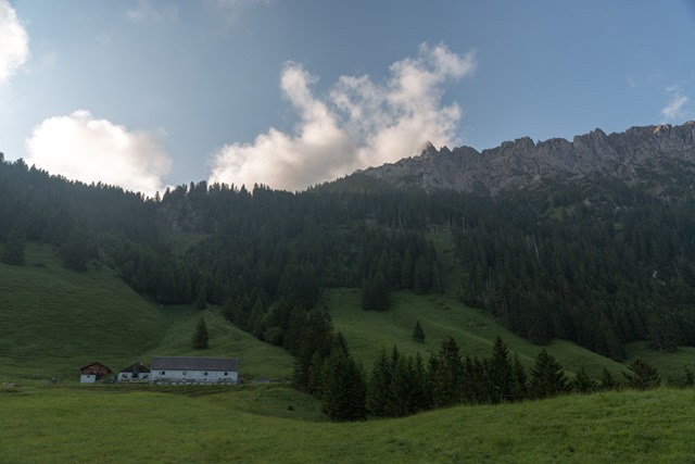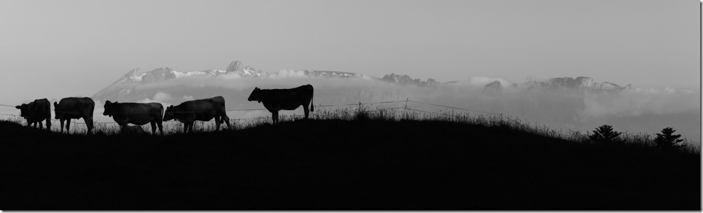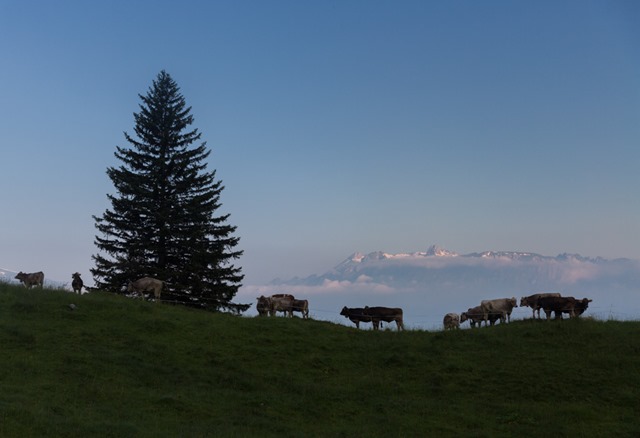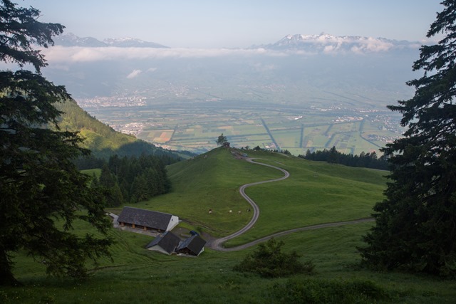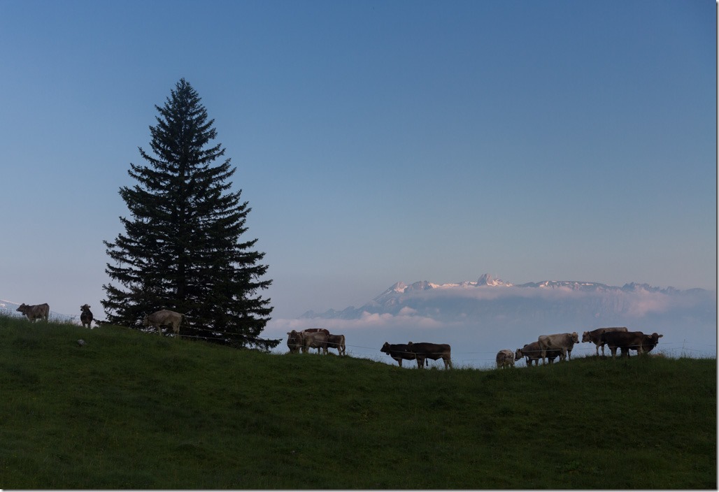 Los ging es kurz vor 6 Uhr oberhalb von Schaan, da ja bekanntlich Morgenstund für manche Dinge gut sein soll. Abmarsch um 6 Uhr heisst übrigens 03:00 aufstehen in Zürich und 04:00 Abfahrt. Zum Glück war ich schon um 24:00 ins Bett gekommen. Die Kühe auf der ersten Alp waren auf jeden Fall hoch erfreut, dass sich so früh jemand um sie kümmern wollte. Muh, Muh, Muh überall, aber trotz mehrfacher Versuche konnte ich sie nicht davon überzeugen, sich fotogen hinzustellen.