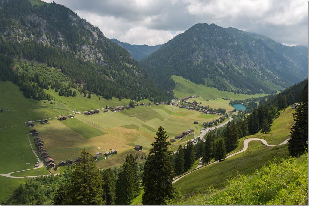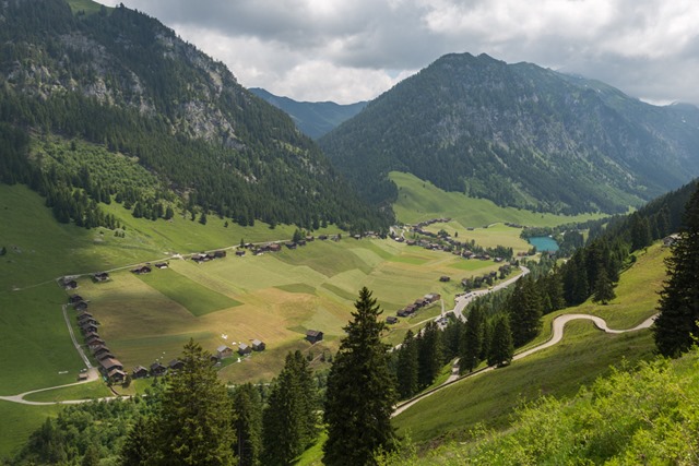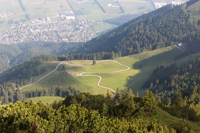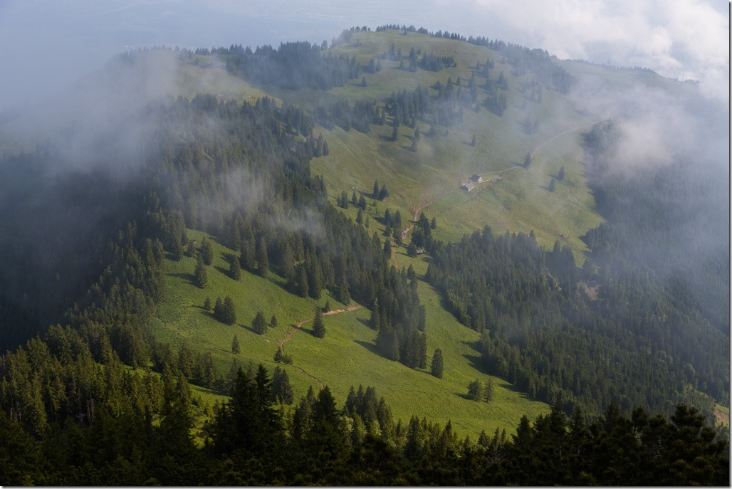 Blick nach unten. Auf dem Weg war ich zuvor unterwegs. Die Kühe hatten sich in der Zwischenzeit vom Baum zu einem Hang aufgemacht. Rechts im Bild sieht man noch eine Hütte, die ich aber im Aufstieg ebenfalls rechts liegen liess.