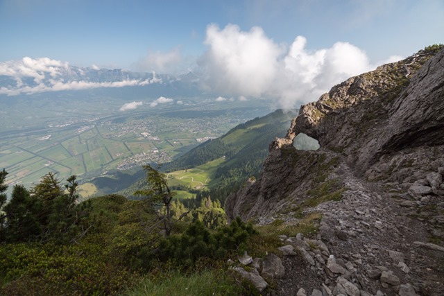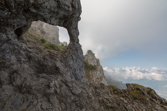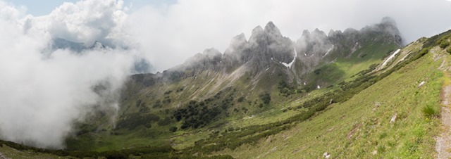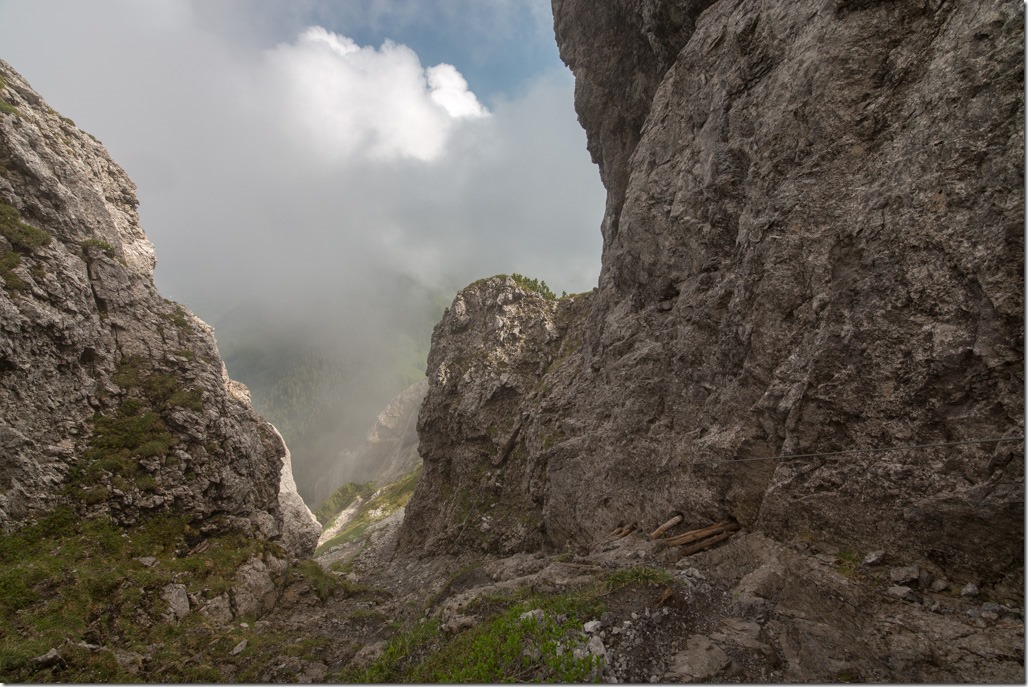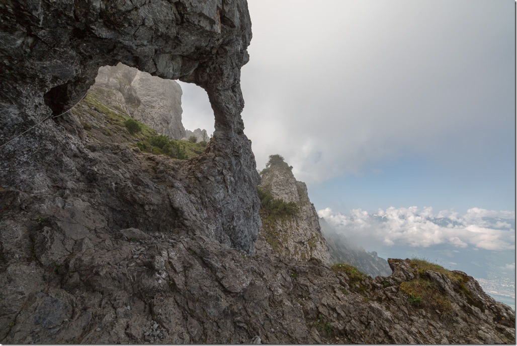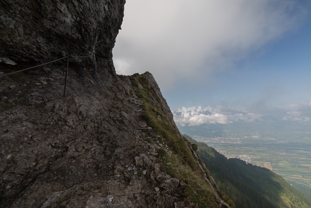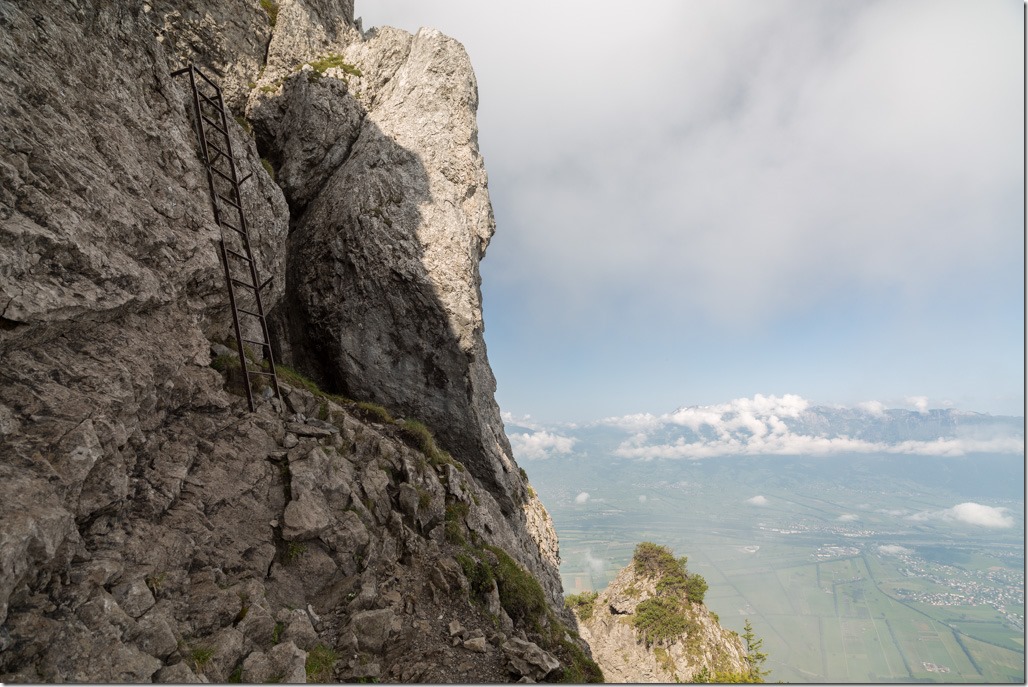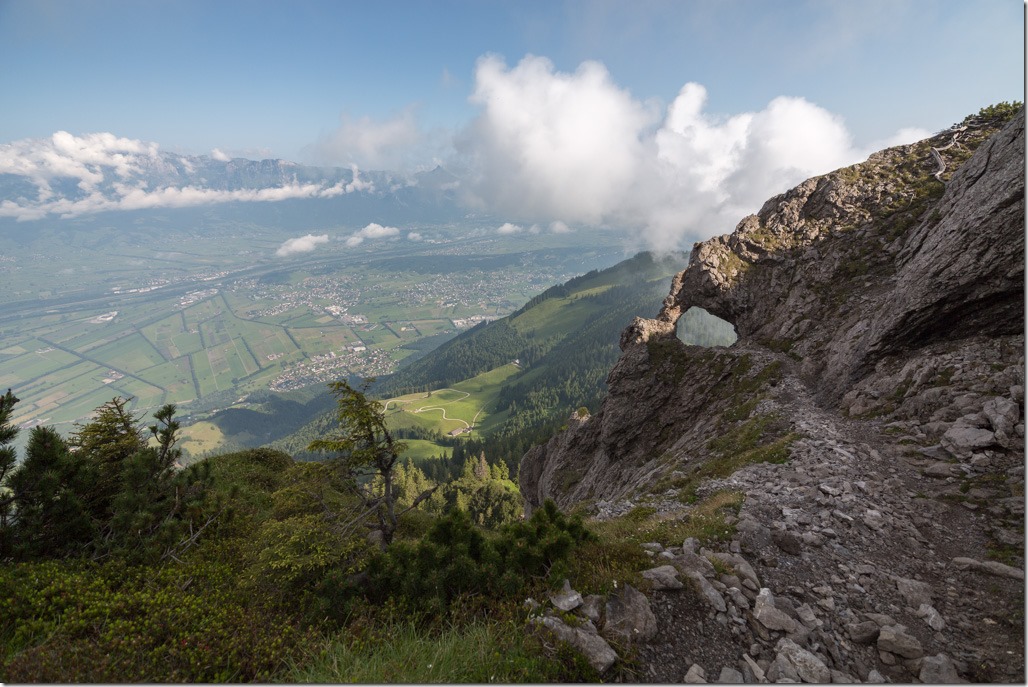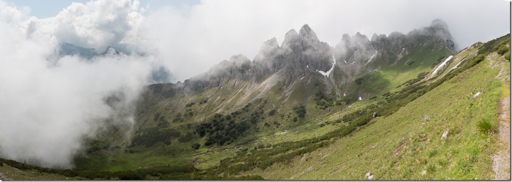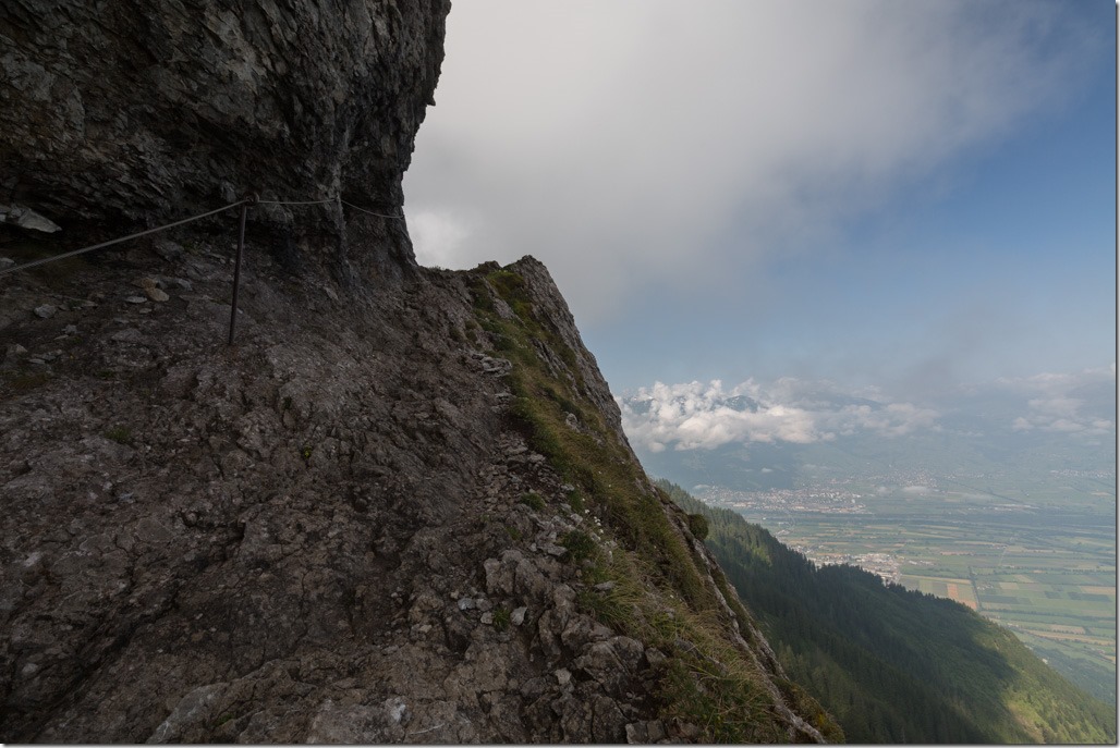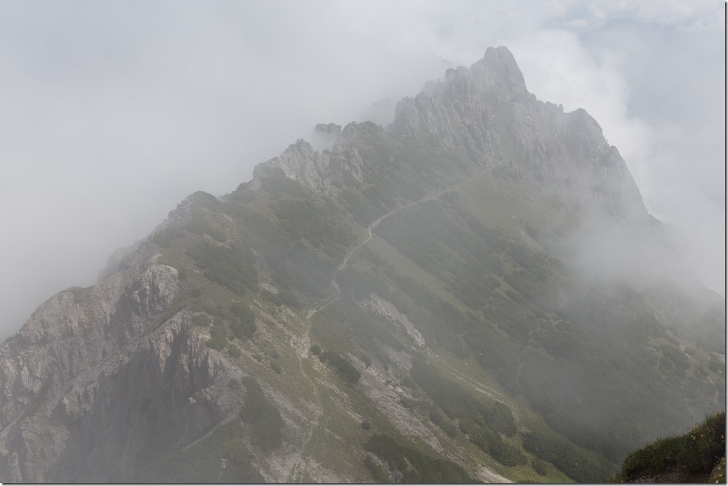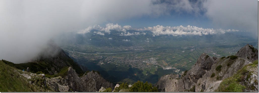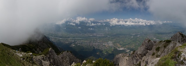 Die Wolkengrenze lag genau auf dieser Höhe. Immer wieder zogen kleinere oder grösser Schwaden vorbei. Die Landesgrenze zwischen Lichtenstein und Österreich verläuft genau auf der Krete.