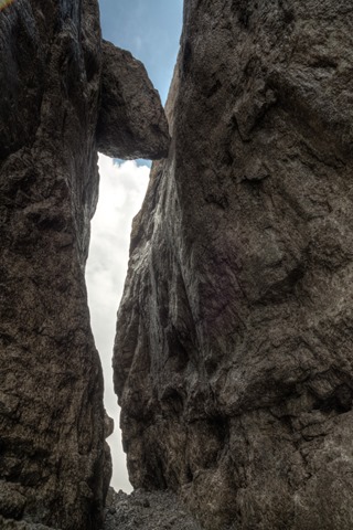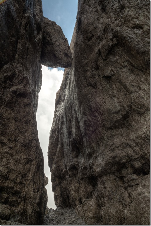 An dieser Stelle möchte ich erwähnen, dass ich zu Übungszwecken meinen Mammut-Rucksack mit sehr viel (sinnlosem) Fotoequipment vollgestopft hatte. Das Startgewicht (mit 2l Flüssigkeit) lag bei rund 18kg. Ich hatte aber auf der ganzen Wanderung überhaupt keine Problem damit, ganz im Gegensatz zu der Woche davor wo ich mit dem grösseren Jack-Wolfskin Rucksack und 21kg ziemlich am Anschlag (sprich an den Druckstellen) war. Zurück zur Wanderung. Hier ist das lange Couloir von unten